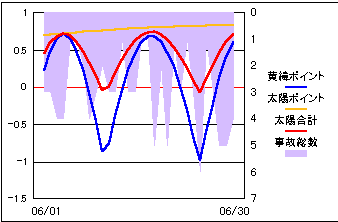 事故総発生件数と太陽地心距離・黄経度差を比較。