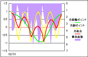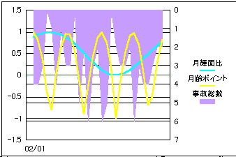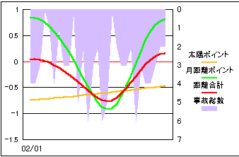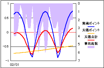 事故総発生件数と太陽地心距離・黄経度差を比較。