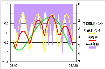 事故総発生件数と太陽地心距離・黄経度差を比較。