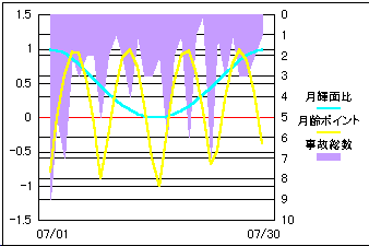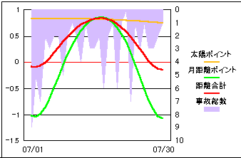 事故総発生件数と太陽地心距離・黄経度差を比較。