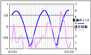 月齢の1/4周期毎に数値化したポイント値と比較。 当月は特に月齢周期とも、はっきりとした影響は見えてきません。 他の月と対照的に関連が全く見られません。 |
