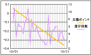 太陽と月の黄緯差を数値化したポイントと比較。 高緯度の差が少ないときに産仔数も減少しているようにも見えます。 やはり、単一要素だけでは明確な相関は見られないようです。 |