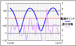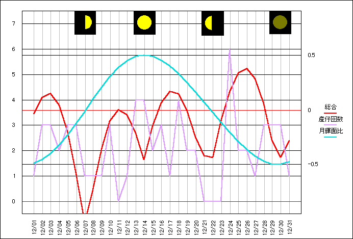 当サイトの危険度グラフの算出項目の変更から、10月分から当ページでも月齢ポイントを位相ポイントに変更しました。 基本的には月齢の1/4周期毎に数値化したポイント値と変わりません。 より輝面比(満ち欠けの様子)に忠実になります。 大まかに4つの谷と一致しているようにも見えますが、はっきりとした影響は現れていないようです。 |