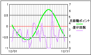 太陽と地球の距離変化を平均距離比率として比較。 下旬に向けて接近を続けています。 単一要素だけでは、やはり産仔回数とは一致していません。 |