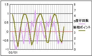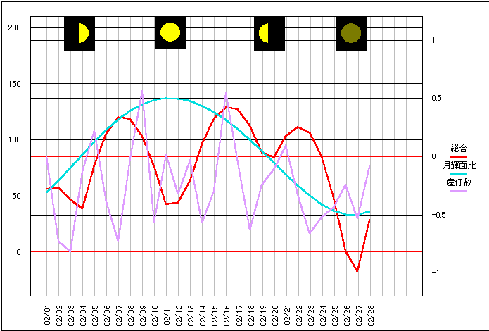 当サイトの危険度グラフの算出項目の変更から、昨年10月分から当ページでも月齢ポイントを位相ポイントに変更しました。 基本的には月齢の1/4周期毎に数値化したポイント値と変わりません。 より輝面比(満ち欠けの様子)に忠実になります。 大まかに4つの谷と一致しているようにも見えますが、はっきりとした影響は現れていないようです。 |