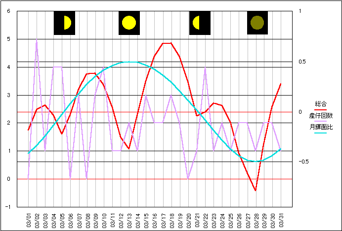 太陽と月の黄緯差を数値化したポイントと比較。 高緯度の差が少ないときに産仔回数も減少しているようにも見えます。 やはり、単一要素だけでは明確な相関は見られないようです。 |