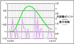 太陽と地球の距離変化を平均距離比率として比較。 上旬に最遠を迎え月末に向け近づいています。 見た目には何となく相関があるようにも見えますが、やはり単一要素だけでは、完全に産仔回数とは一致していません。 |