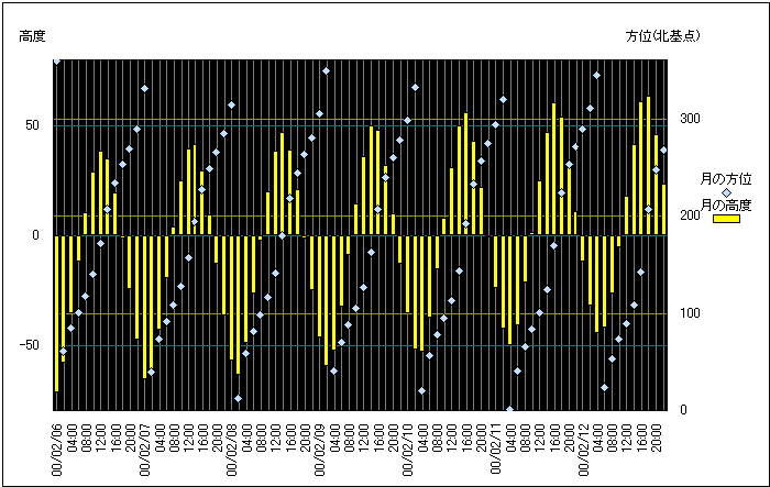 ![]() | 任意日時で月齢や月と太陽の位置や距離を算出します。 | |