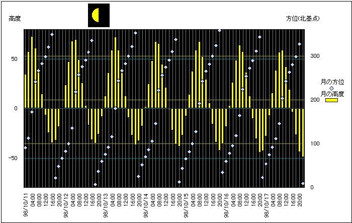 ![]() | 任意日時で月齢や月と太陽の位置や距離を算出します。 | |
