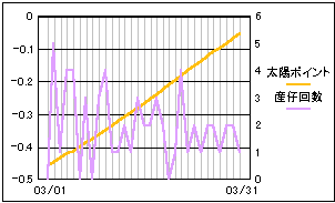 太陽と月の黄緯差を数値化したポイントと比較。 高緯度の差が少ないときに産仔回数も減少しているようにも見えます。 やはり、単一要素だけでは明確な相関は見られないようです。 |