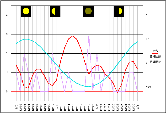 当サイトの危険度グラフの算出項目の変更から、昨年10月分から当ページでも月齢ポイントを位相ポイントに変更しました。 基本的には月齢の1/4周期毎に数値化したポイント値と変わりません。 より輝面比(満ち欠けの様子)に忠実になります。 大まかに4つの谷と一致しているようにも見えますが、はっきりとした影響は現れていないようです。 | |