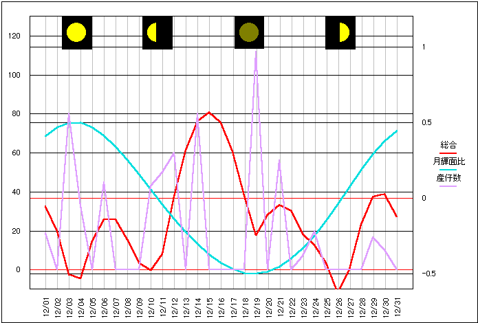 太陽と月の黄緯差を数値化したポイントと比較。 高緯度の差が少ないときに産仔回数も減少しているようにも見えます。 黄緯度差が0度に近い時期に産仔数・回数が減少に向かう傾向は、朔望と一致した時期ではないかと思われます。 日食や月食時の産仔数・回数減少についての統計調査を進めています。 いずれにしても、単一要素だけでは明確な相関は見られないようです。 | |