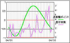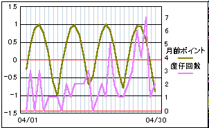 月齢の1/4周期毎に数値化したポイント値と比較。 7日が新月で、22日が満月です。 大まかに4つの谷と一致しているようですが、はっきりとした影響は見えてきません。 |