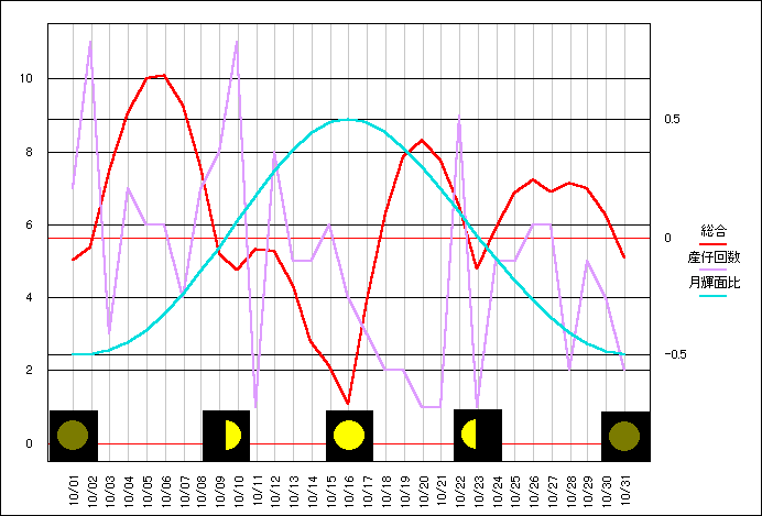 当サイトの危険度グラフの算出項目の変更から、今月分から当ページでも月齢ポイントを位相ポイントに変更しました。 基本的には月齢の1/4周期毎に数値化したポイント値と変わりません。 より輝面比(満ち欠けの様子に)忠実になります。 大まかに4つの谷と一致しているようにも見えますが、はっきりとした影響は現れていないようです。 |
