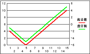 もう一点、こちらも極端な例ですが、これは危険度が低いときに産仔数が増加する場合に上のようなグラフになります。
